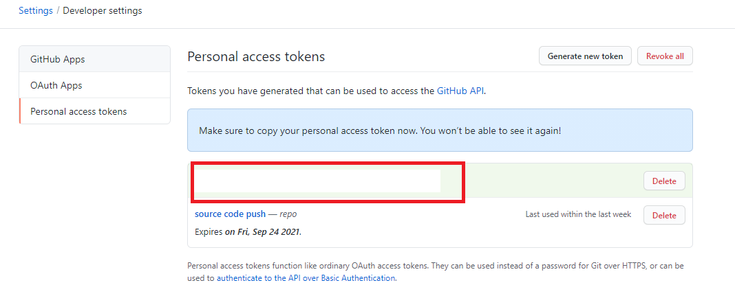 - 이제 원격 저장소에 접근하기 위해 인증 필요시 기존의 비밀번호 대신에 토큰 값을 넣으면 된다.